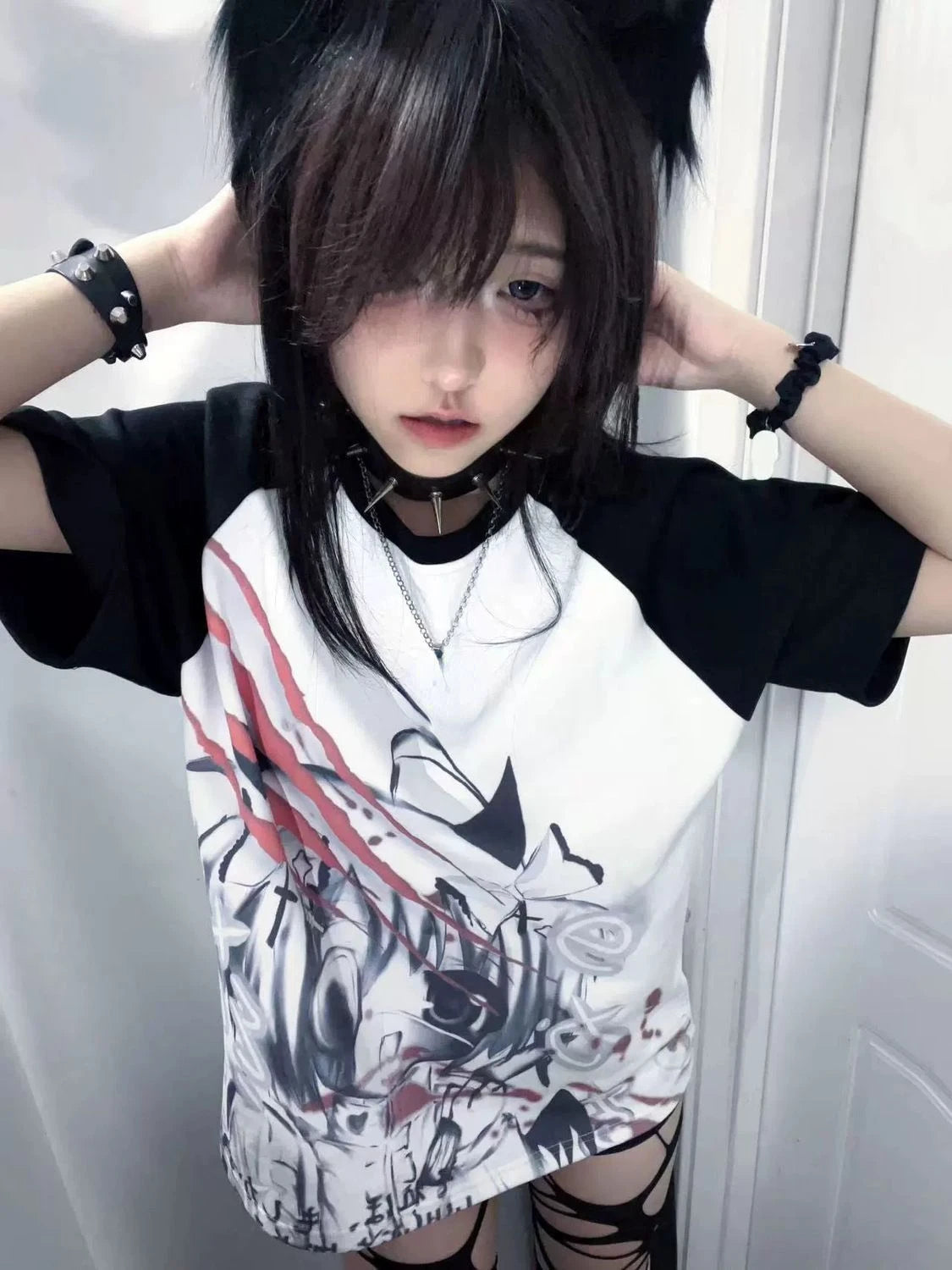 Y2K Gothic Anime Print Tee - Harajuku Grunge Fairy